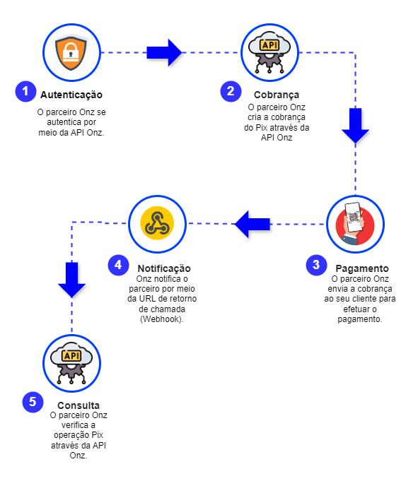 Com a autenticação concluída, o parceiro Onz está pronto para criar cobranças Pix através da API disponibilizada pela Onz. Através desta interface, o parceiro pode gerar cobranças de forma simples e rápida, especificando detalhes necessários como o valor da fatura e a chave Pix do destinatário. - Pagamento: